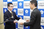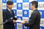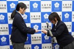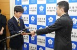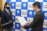 研修費目録を受け取った代表生徒中高一貫2年A組の冨岡くんより
