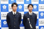 また、万博探究に参加する中高一貫2年A組の冨岡くんと中学2年B組の中野くんによる事前学習の報告会も行われました 。