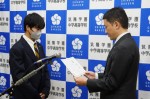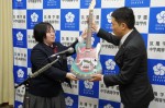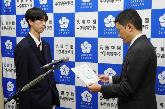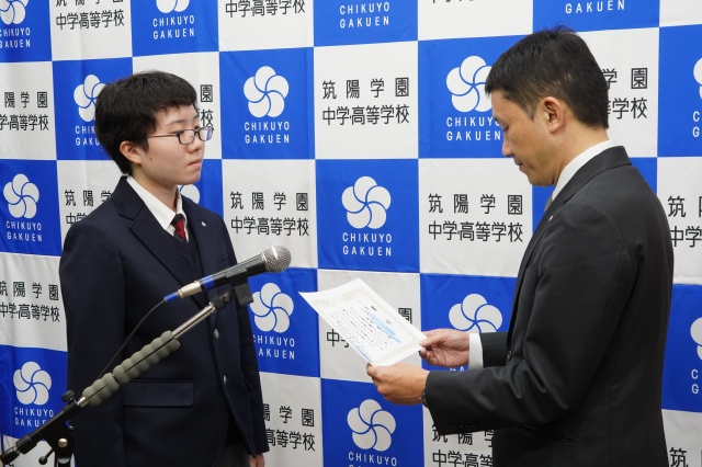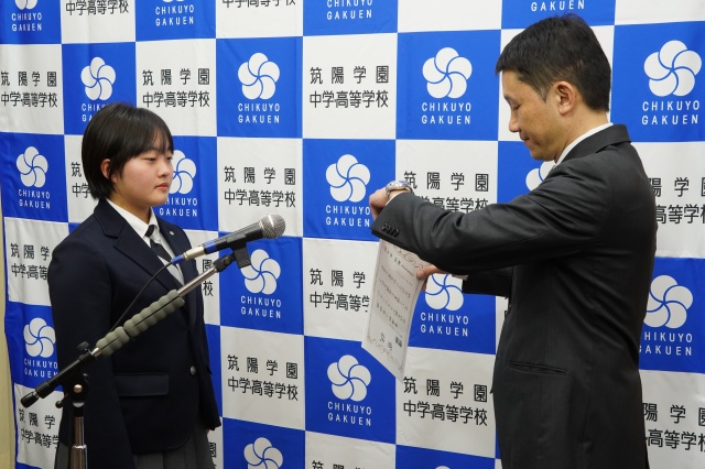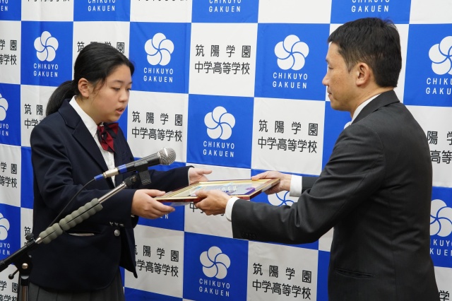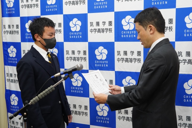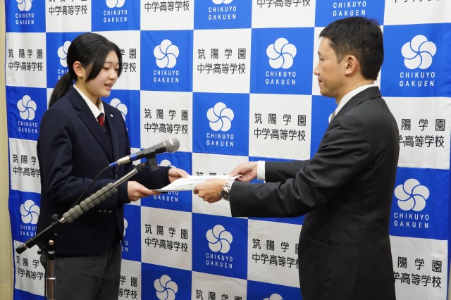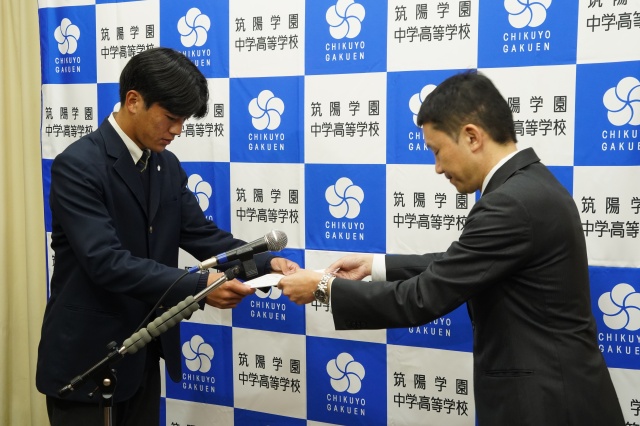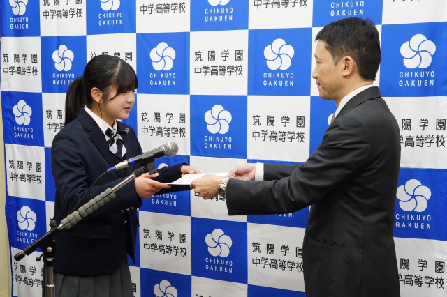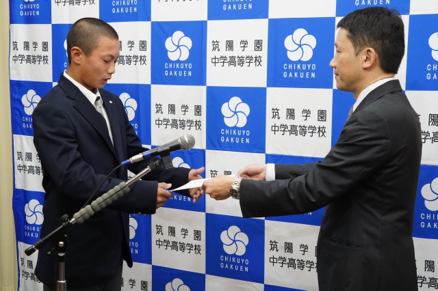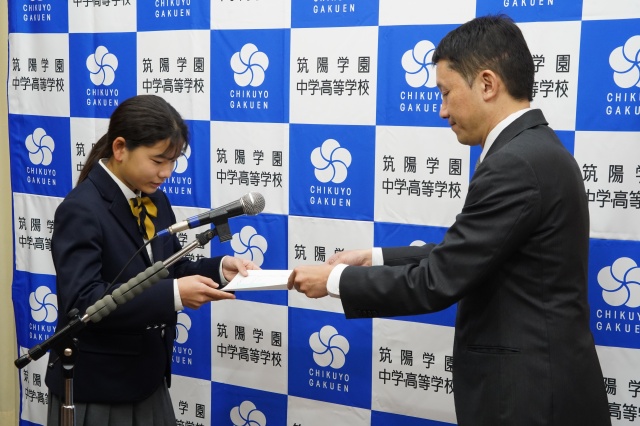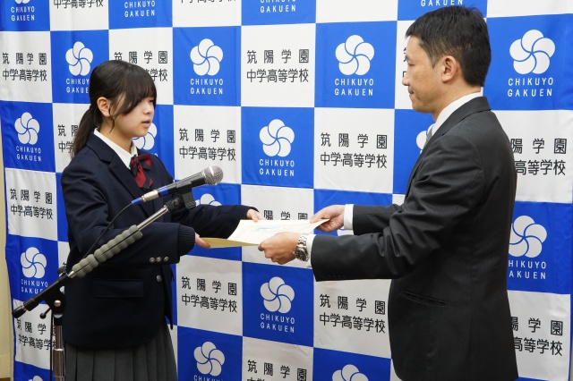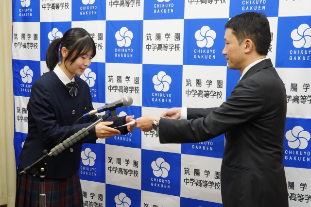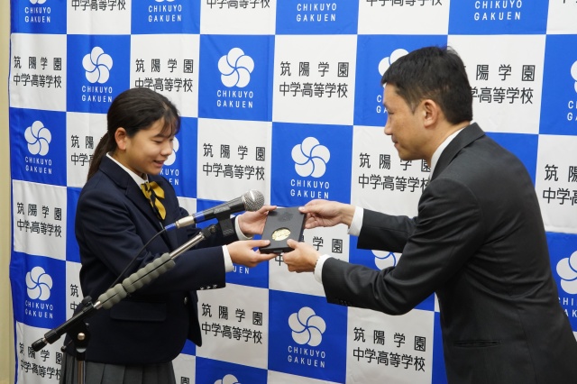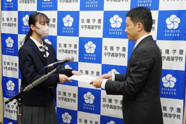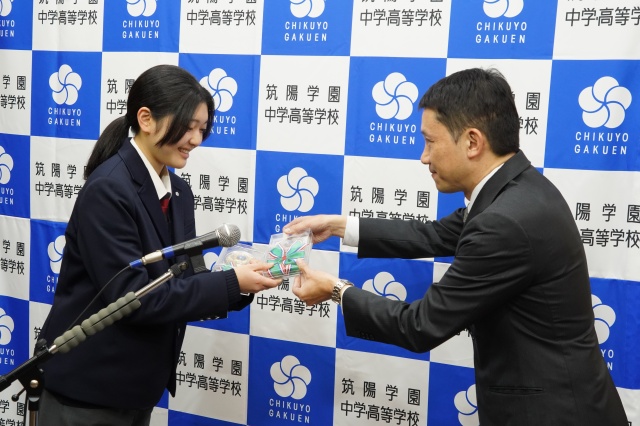 続いて、生徒会よりお祝い金と生徒たちが激励の気持ちを込めて折った千羽鶴が手渡されました。