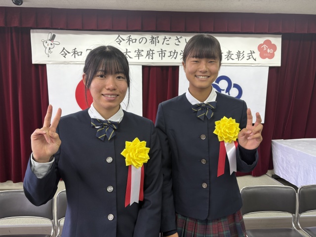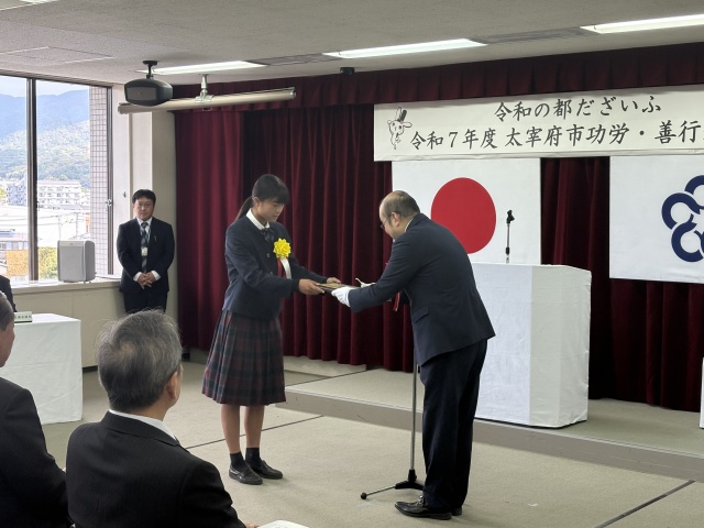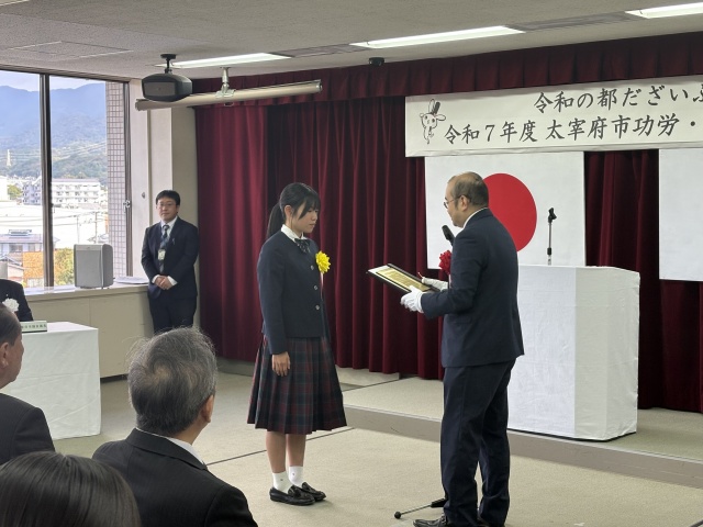 この度、本校の生徒2名が、その輝かしい功績を称えられ、令和7年度 太宰府市市長特別賞を受賞いたしました。