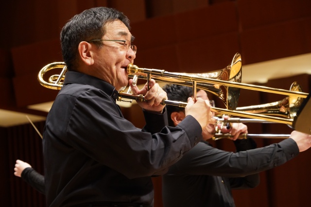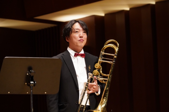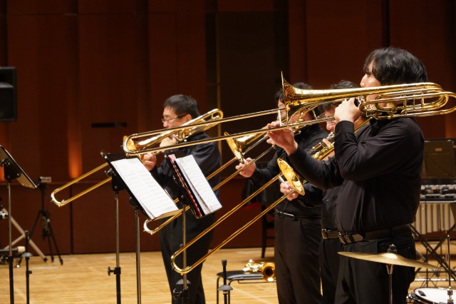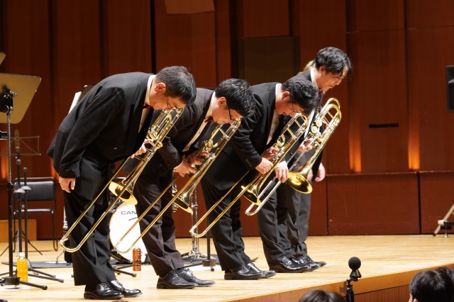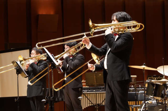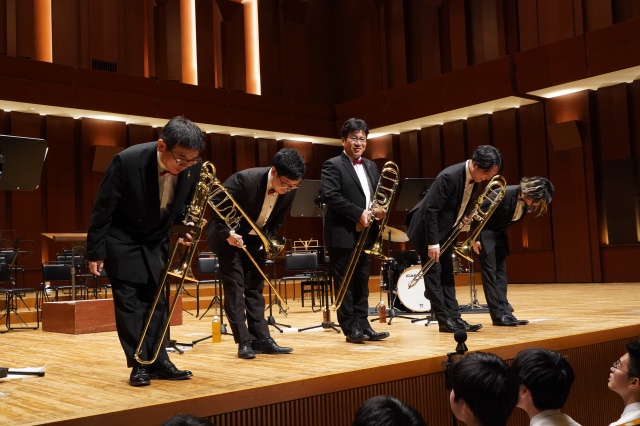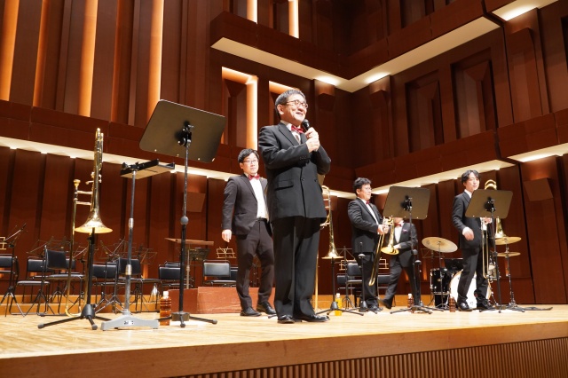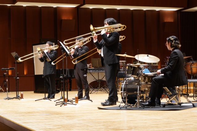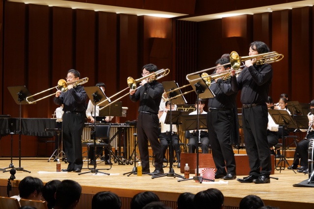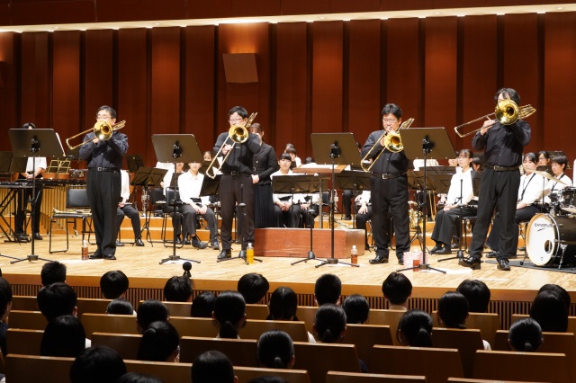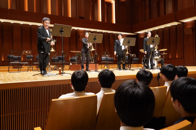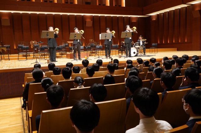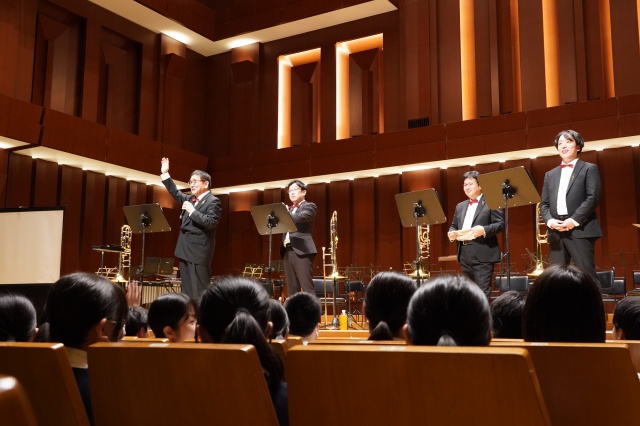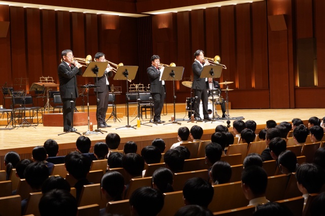 今年の芸術鑑賞は、宮崎大学吹奏楽部のトロンボーンパート出身者で構成され、福岡を拠点に活動されている「トロンボーンアンサンブル MUTE」の皆さんをお招きし、素晴らしい演奏と心温まるメッセージをいただきました。