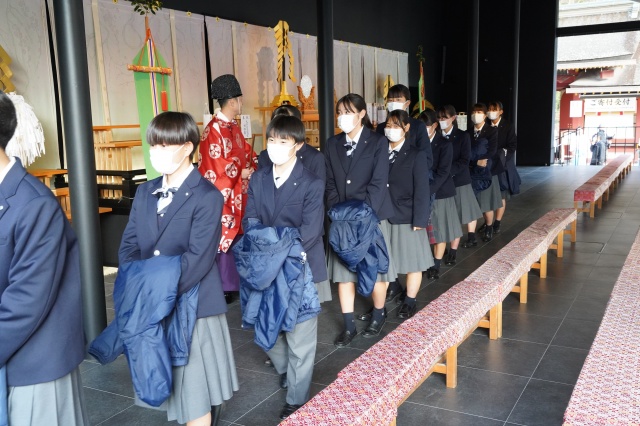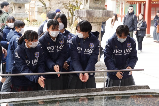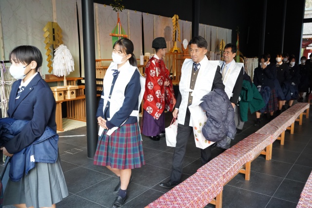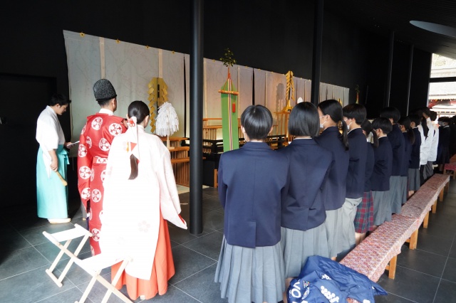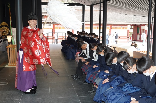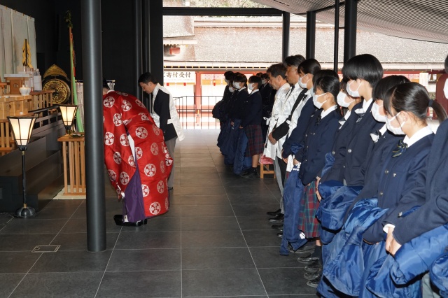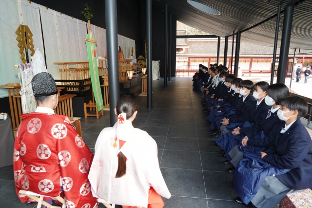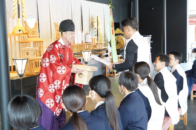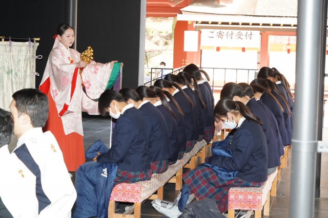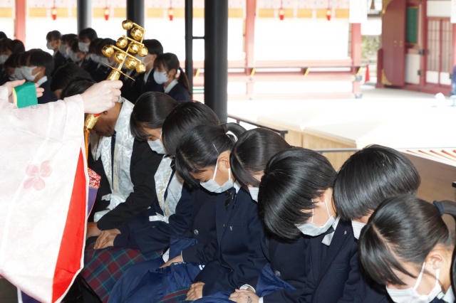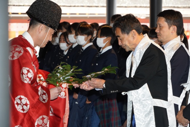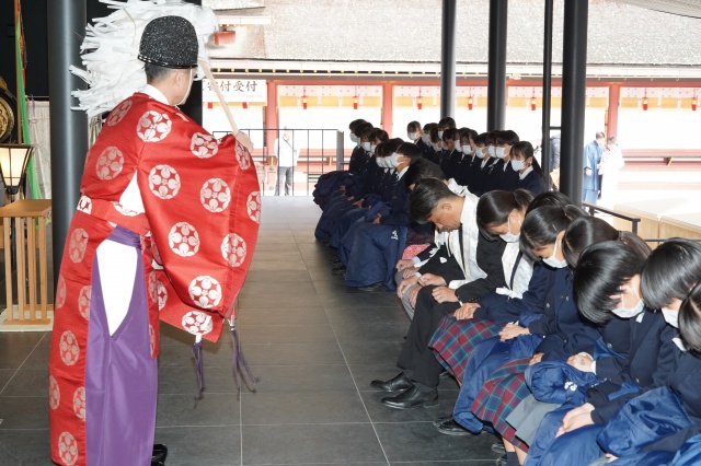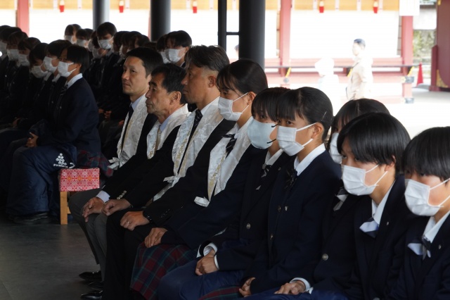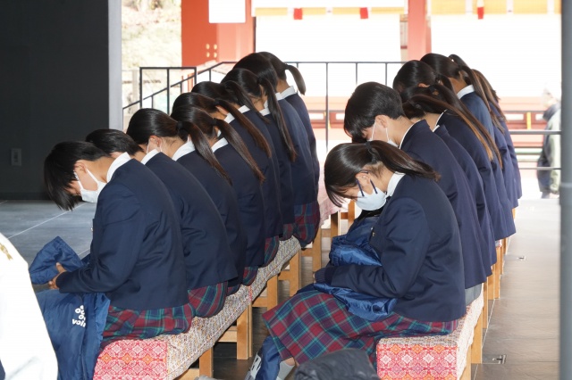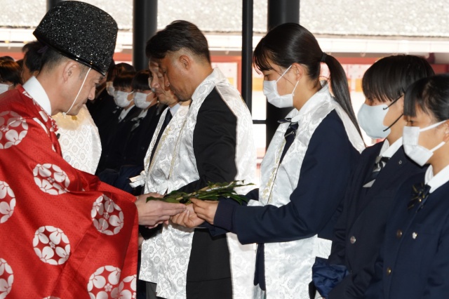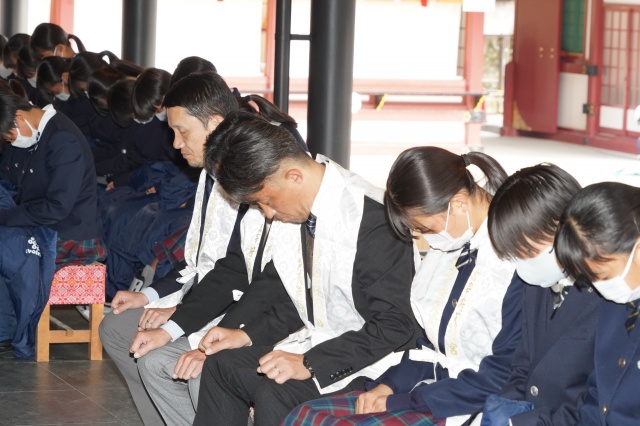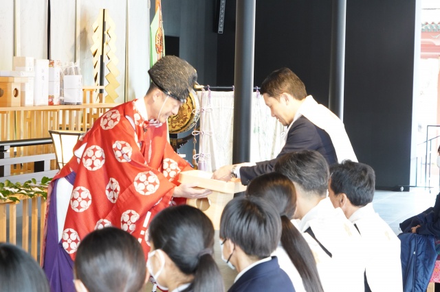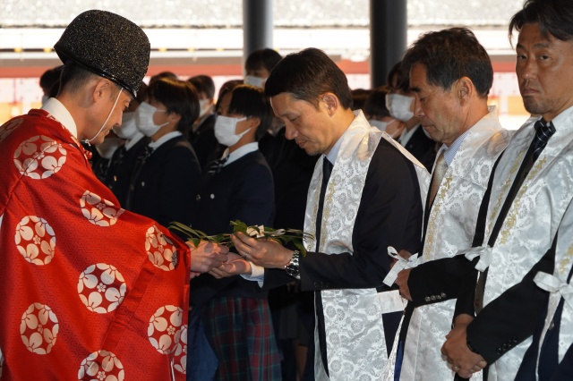 祈願では、必勝祈願の祝詞が奏上され、校長先生、総監督、監督と主将が玉串奉奠をし、全員で全国制覇を願いました。